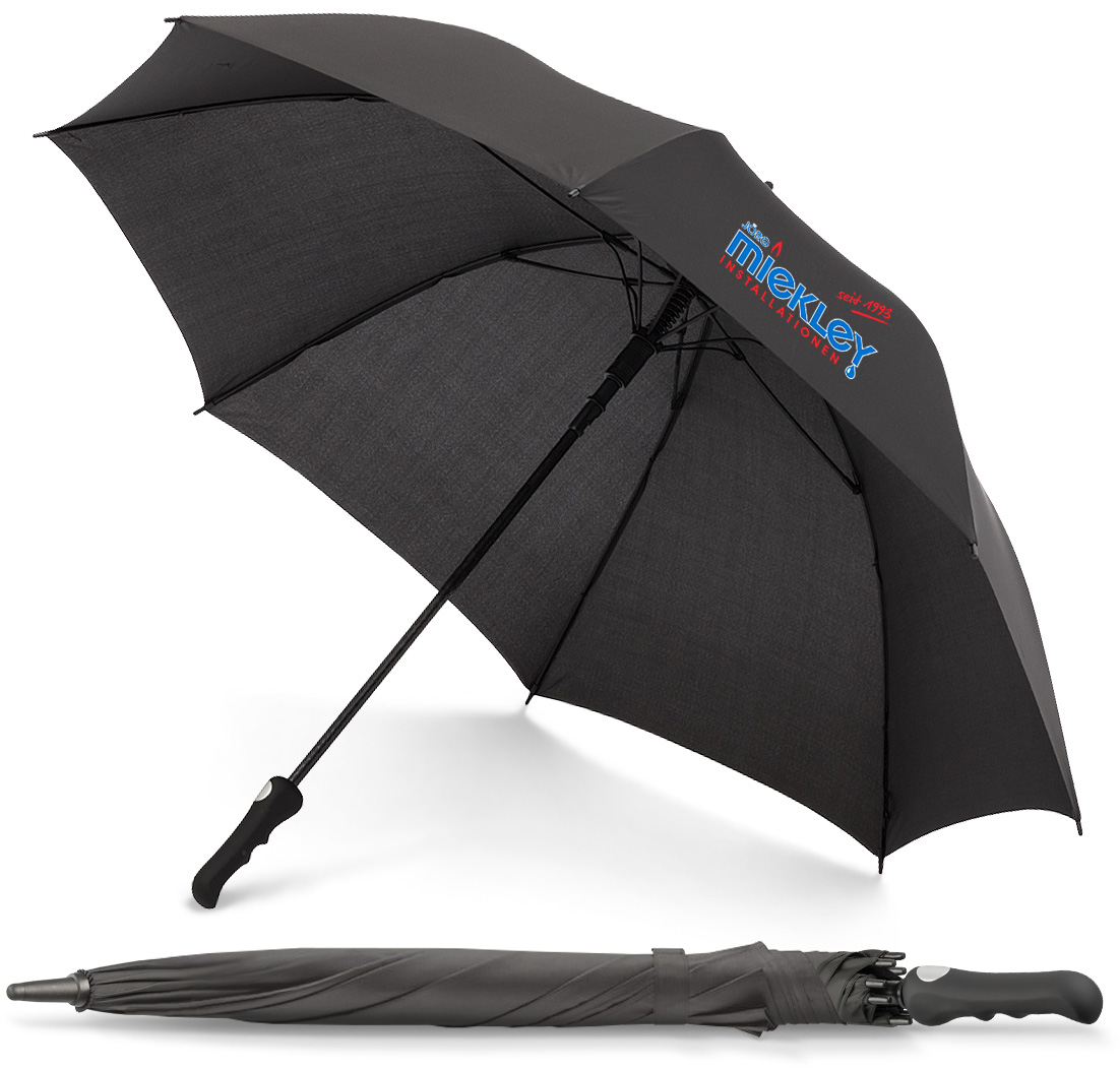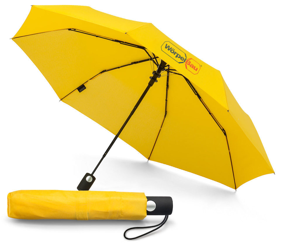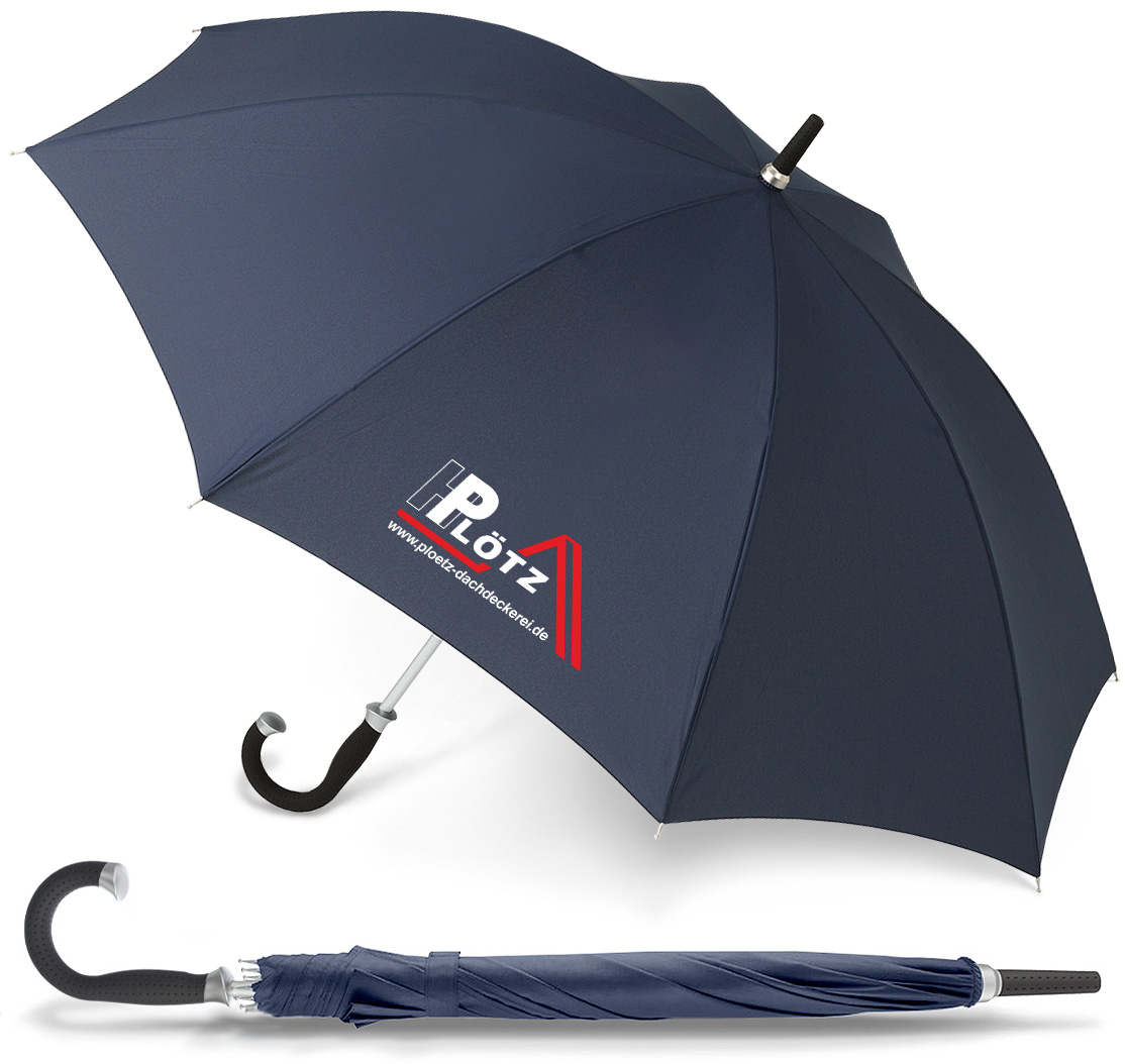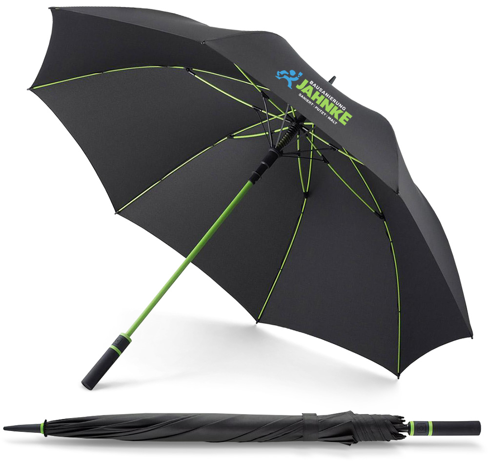 Stylischer Gästeschirm mit komfortabler Öffnungsautomatik, maximale Gestell-Flexibilität (Windproof-System) bei stärkeren Windböen, flexible Fiberglasschienen, stabiler Stahlstock mit farbiger Kunststoffummantelung, gerader Softfeel-Griff mit 7 farbigen Griffringen – passend zu Ihrem Firmenlogo!Speichenlänge: ca. 65 cm