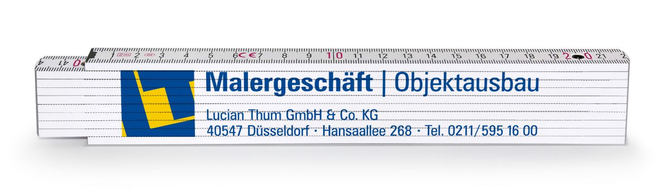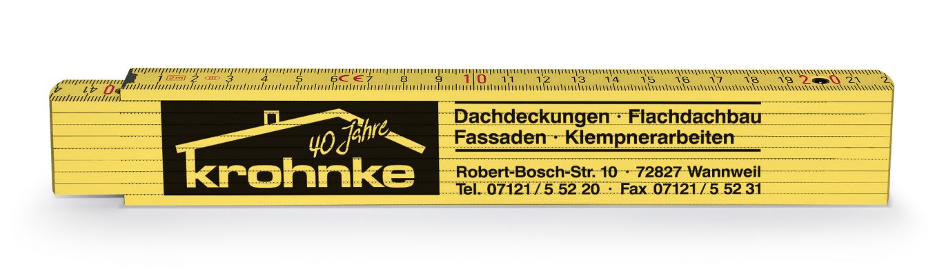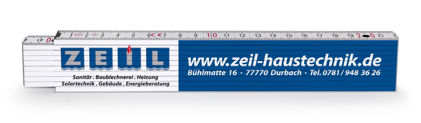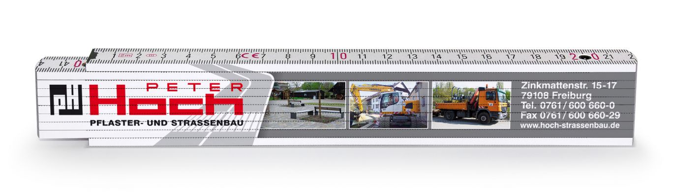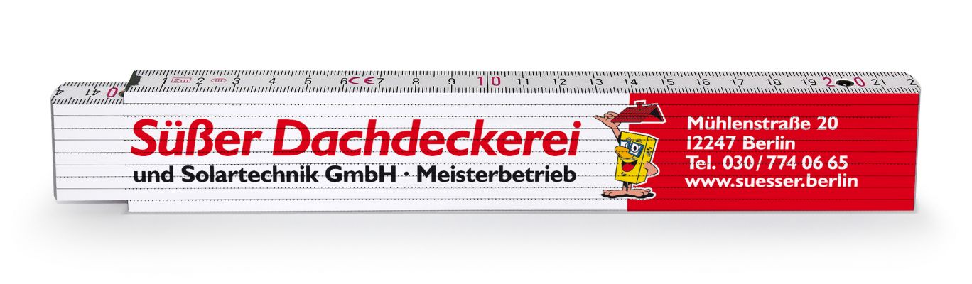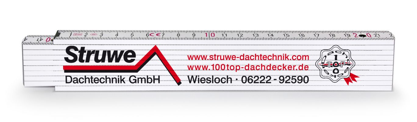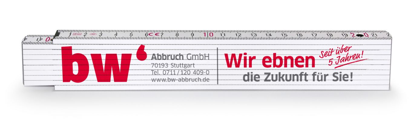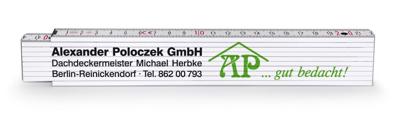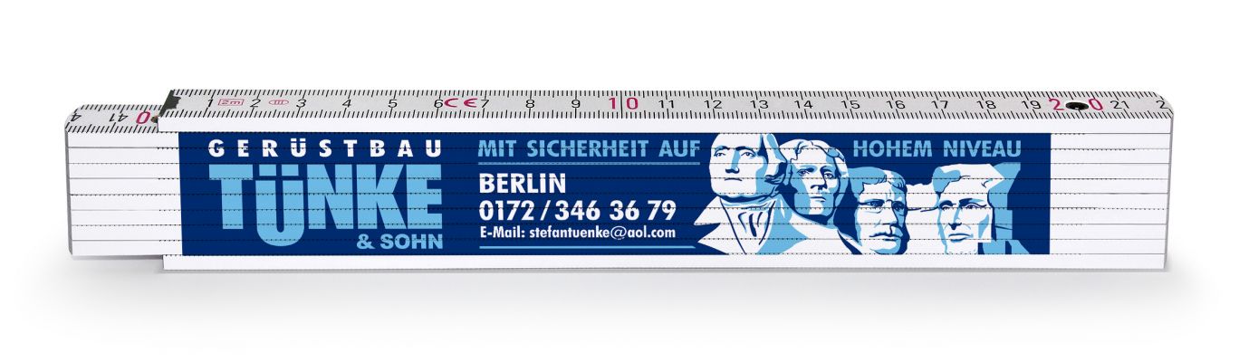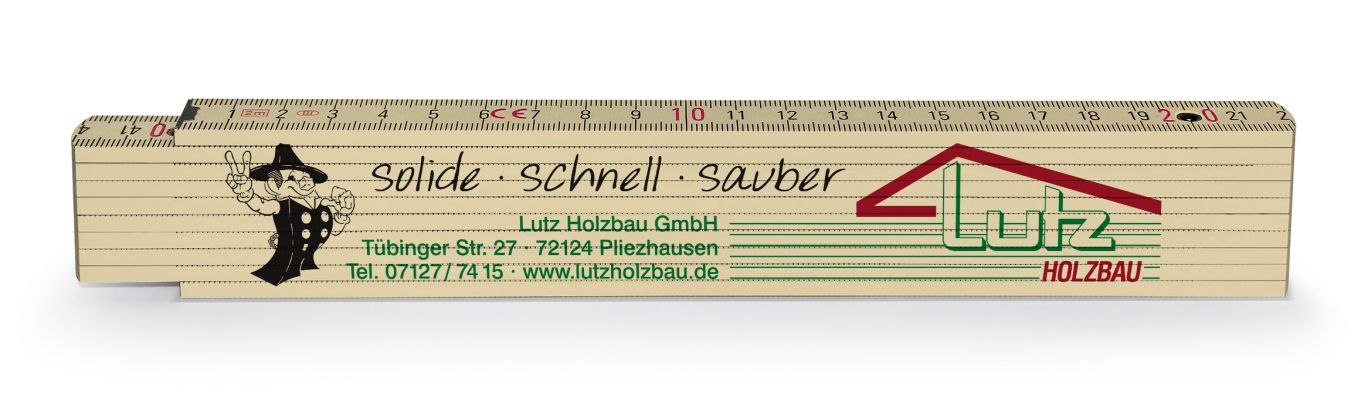 Unsere hochwertigen Zollstöcke garantieren Ihnen einen Werbeträger, der Ihr Unternehmen lange Zeit repräsentiert. Hochwertig in Material und Druck, von unserer Grafikabteilung werbewirksam und prägnant gestaltet.