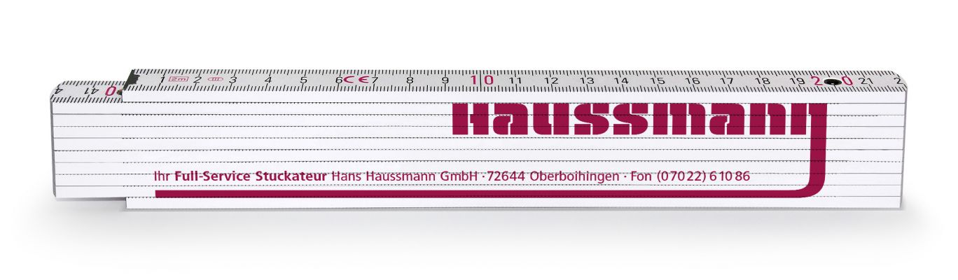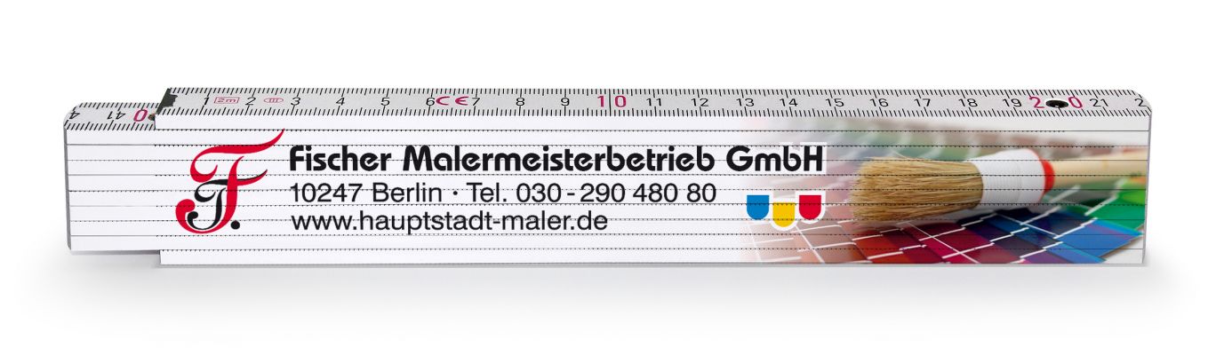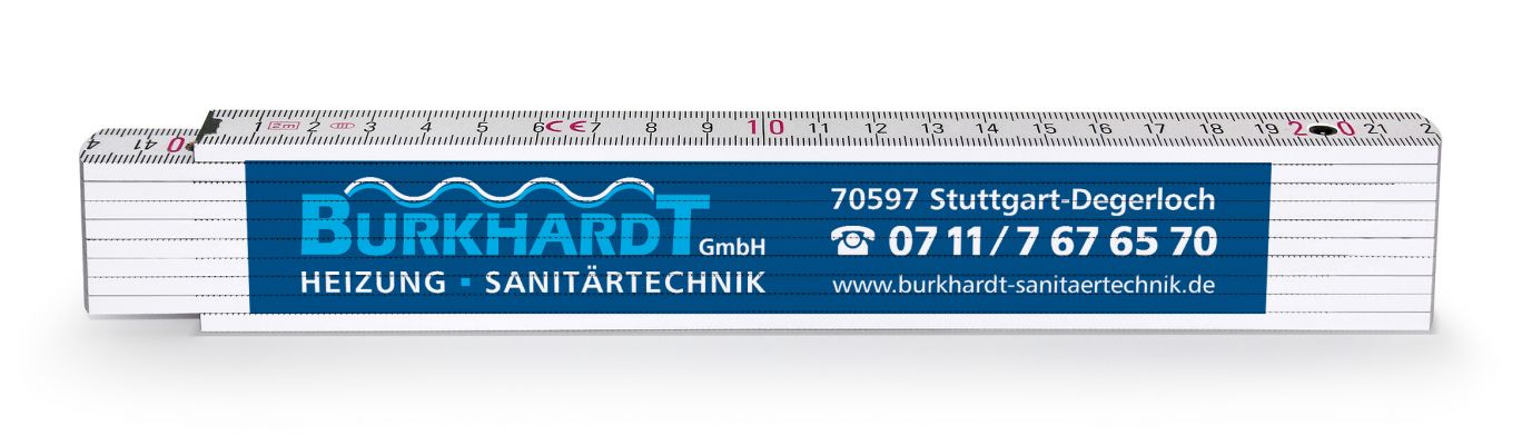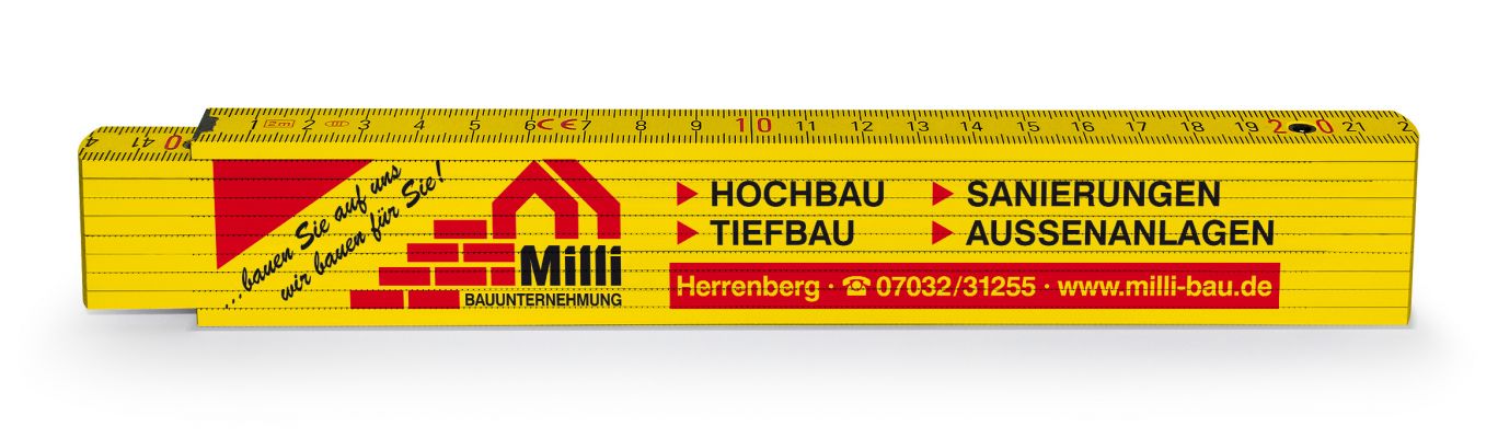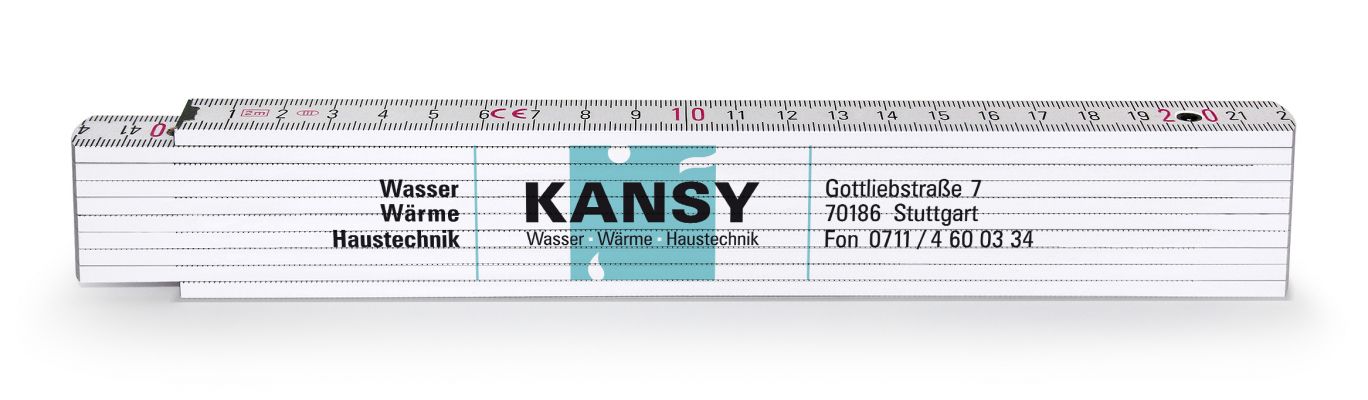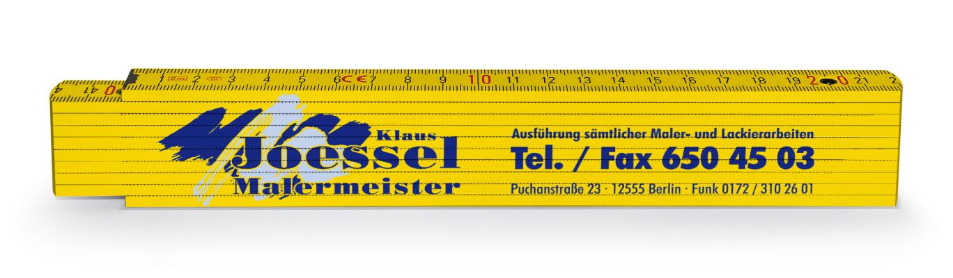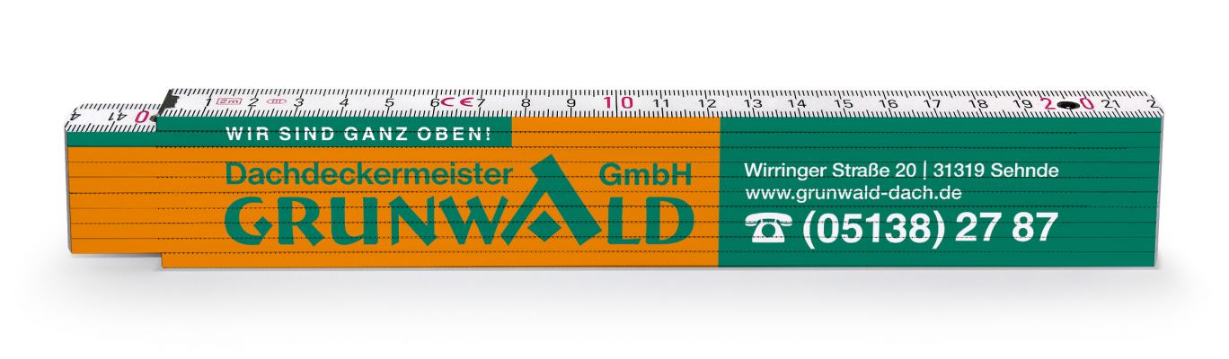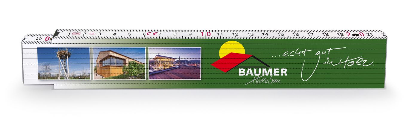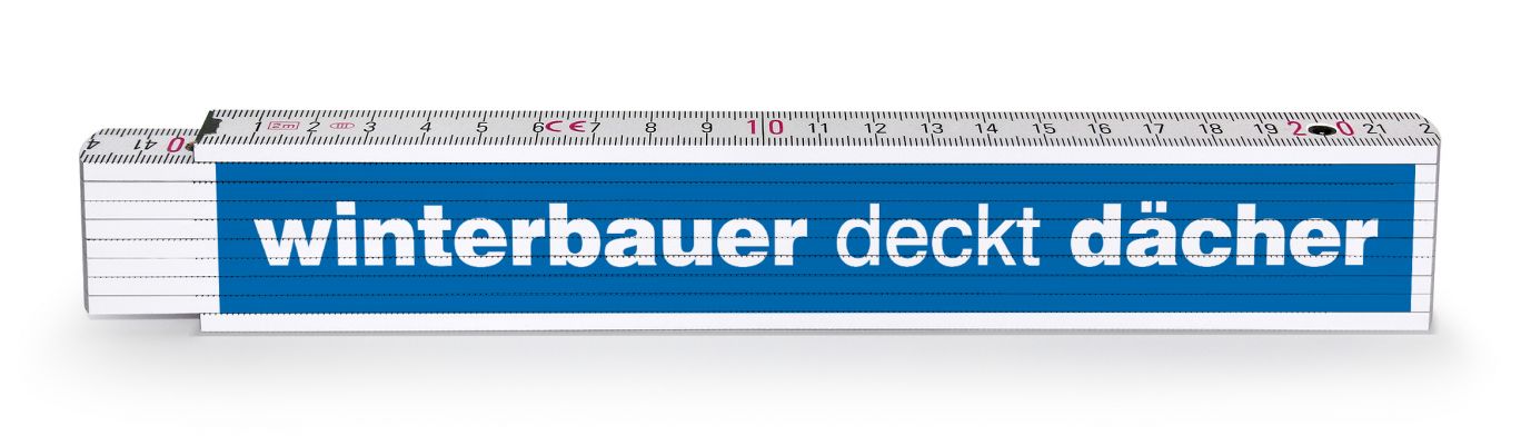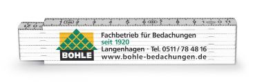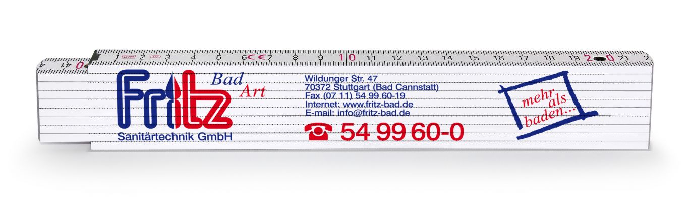 Unsere hochwertigen Zollstöcke garantieren Ihnen einen Werbeträger, der Ihr Unternehmen lange Zeit repräsentiert. Hochwertig in Material und Druck, von unserer Grafikabteilung werbewirksam und prägnant gestaltet.