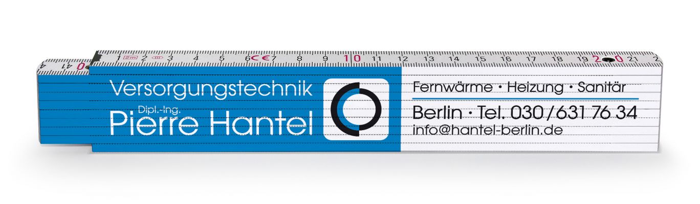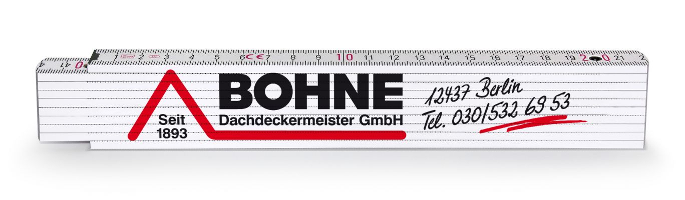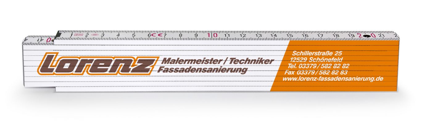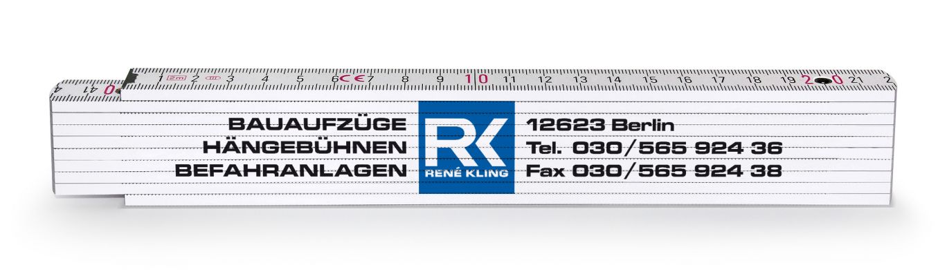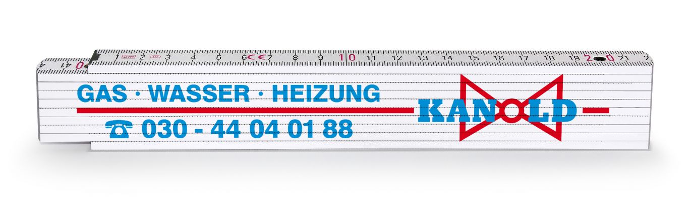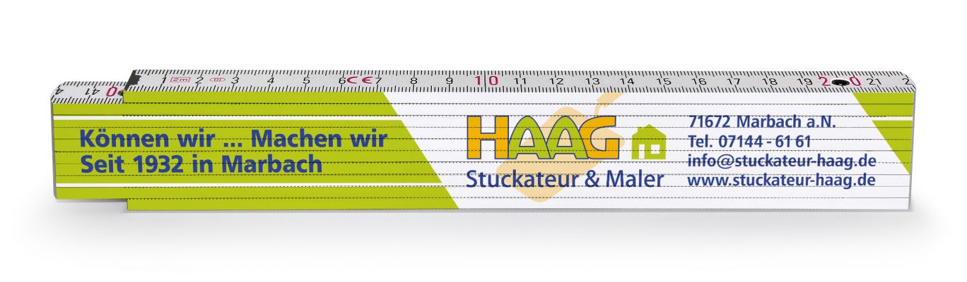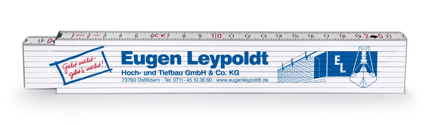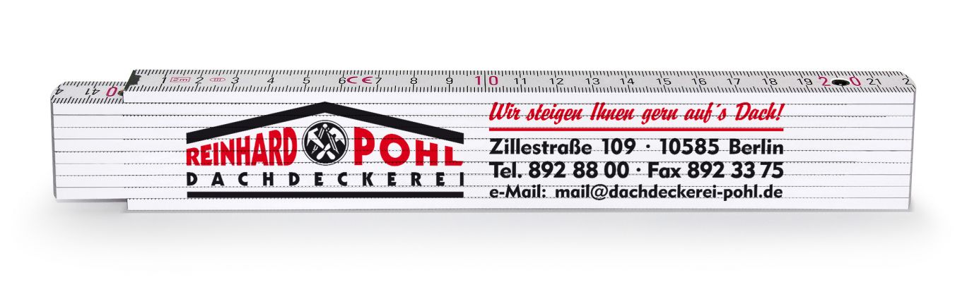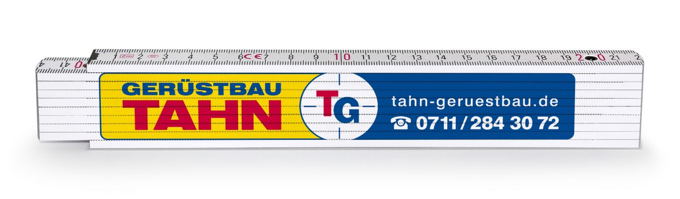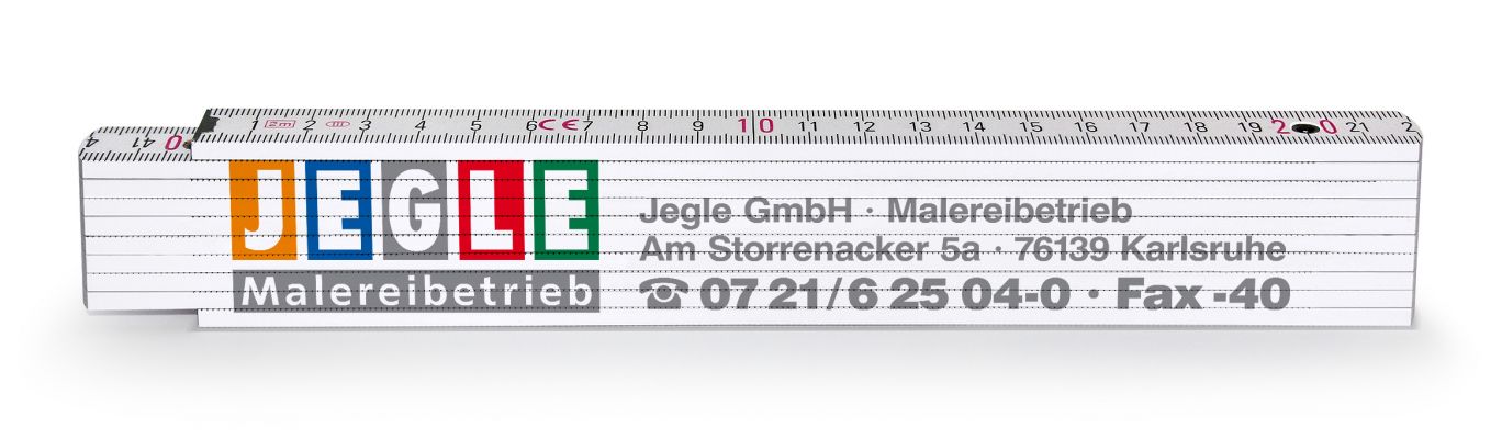 Unsere hochwertigen Zollstöcke garantieren Ihnen einen Werbeträger, der Ihr Unternehmen lange Zeit repräsentiert. Hochwertig in Material und Druck, von unserer Grafikabteilung werbewirksam und prägnant gestaltet.