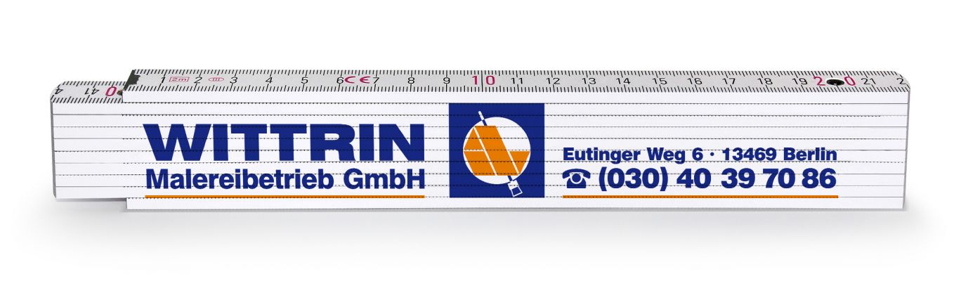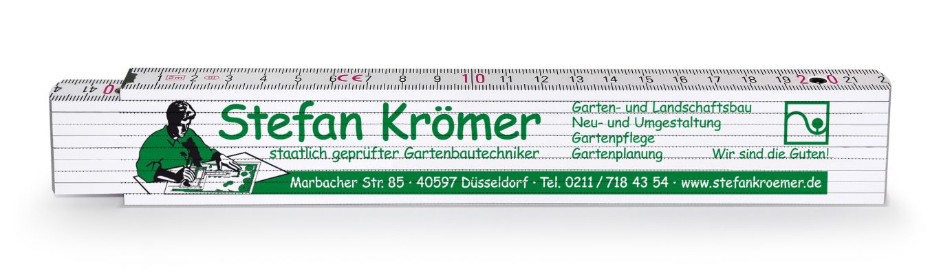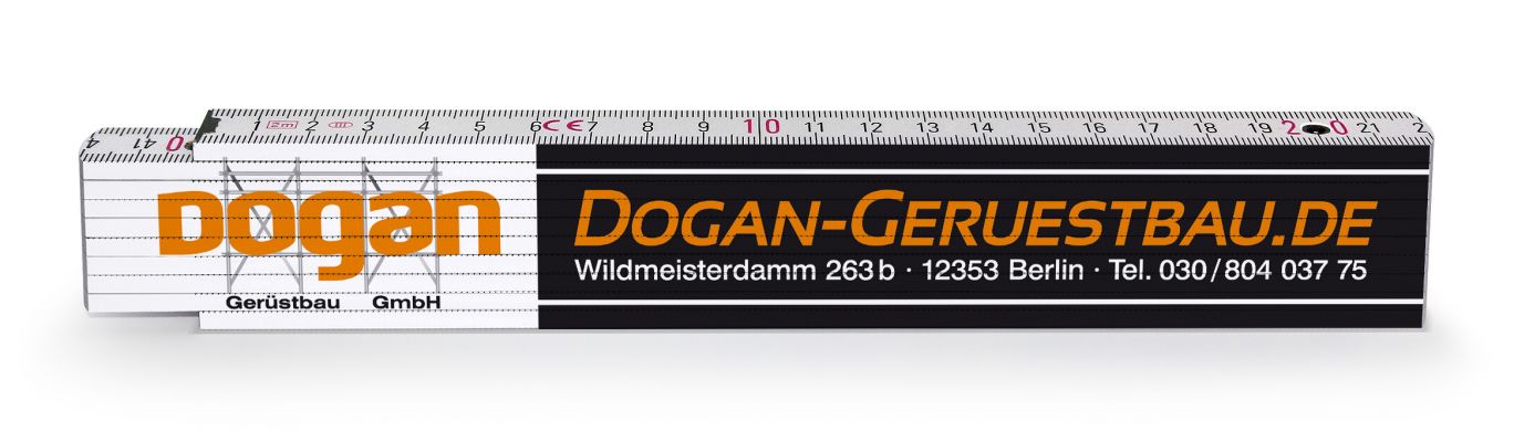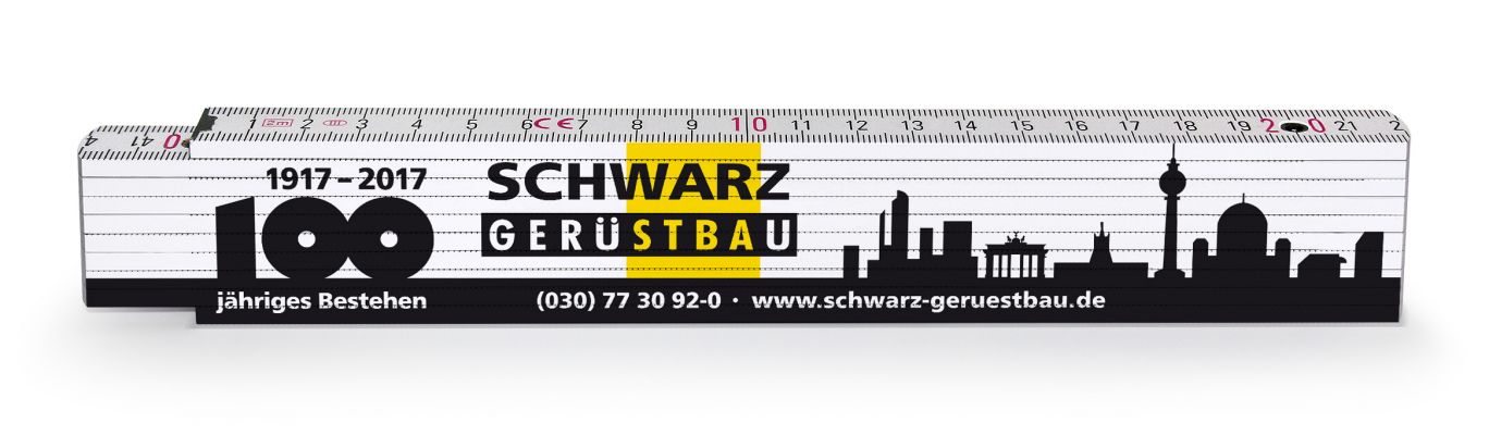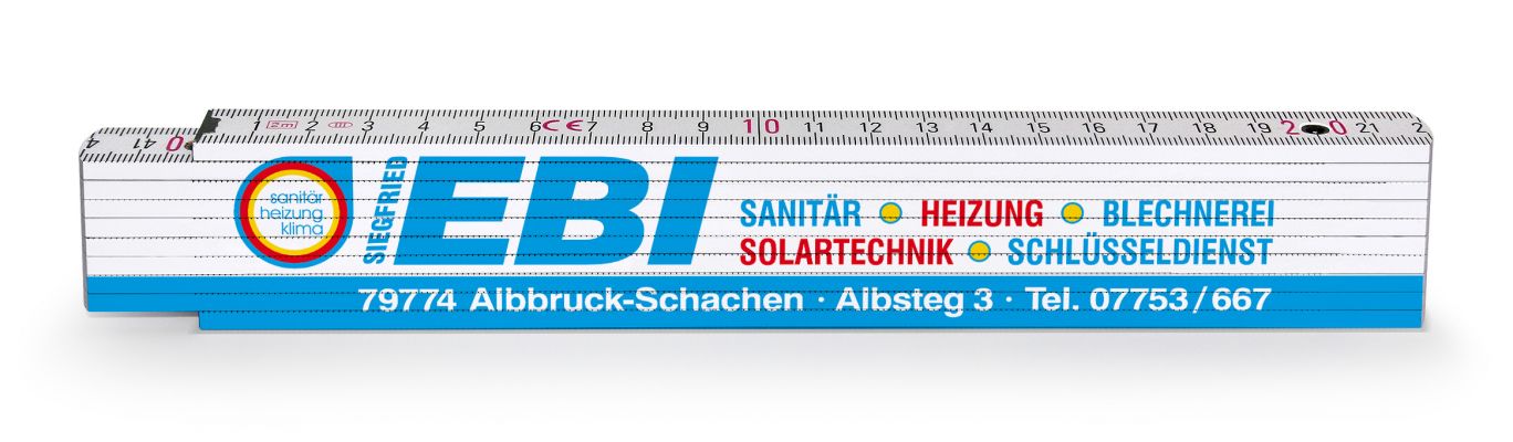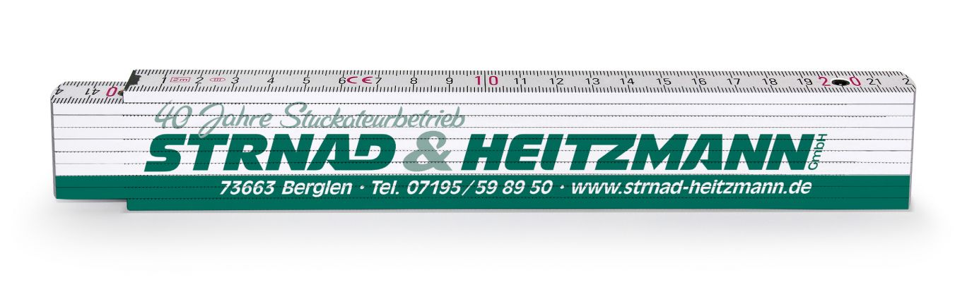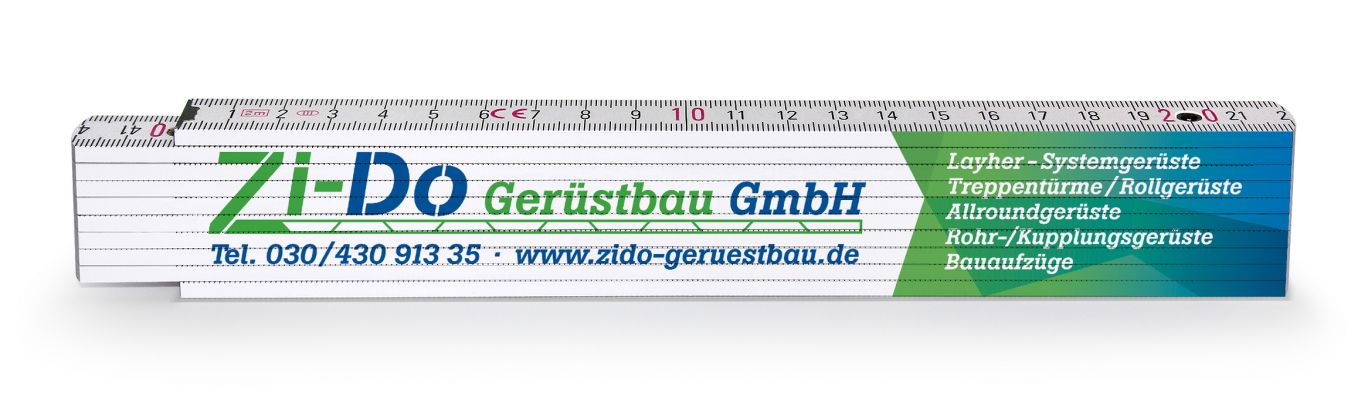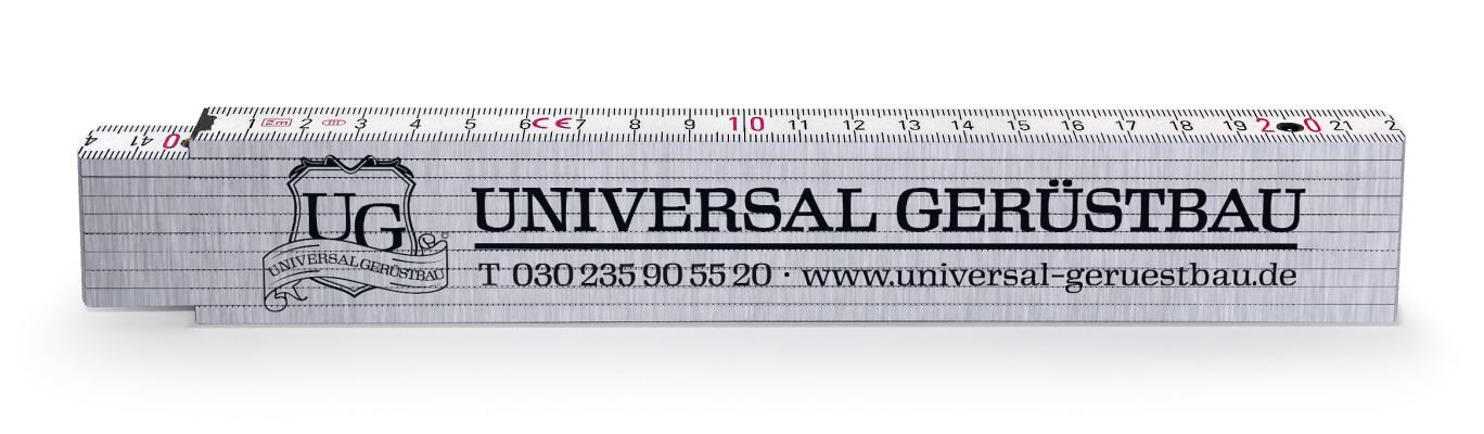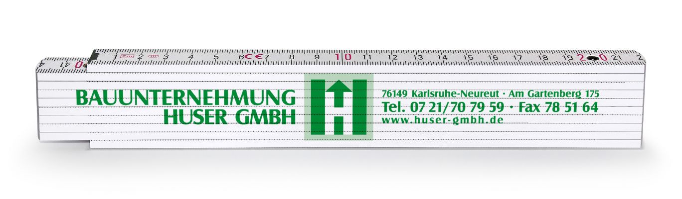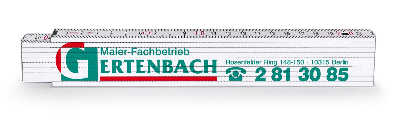 Unsere hochwertigen Zollstöcke garantieren Ihnen einen Werbeträger, der Ihr Unternehmen lange Zeit repräsentiert. Hochwertig in Material und Druck, von unserer Grafikabteilung werbewirksam und prägnant gestaltet.