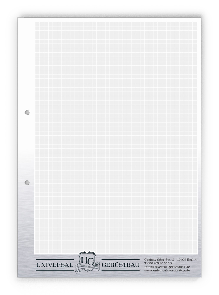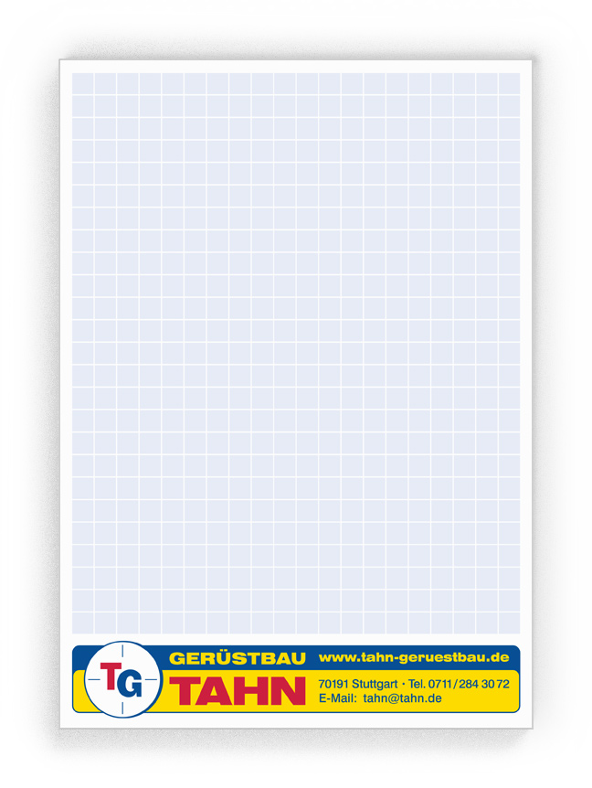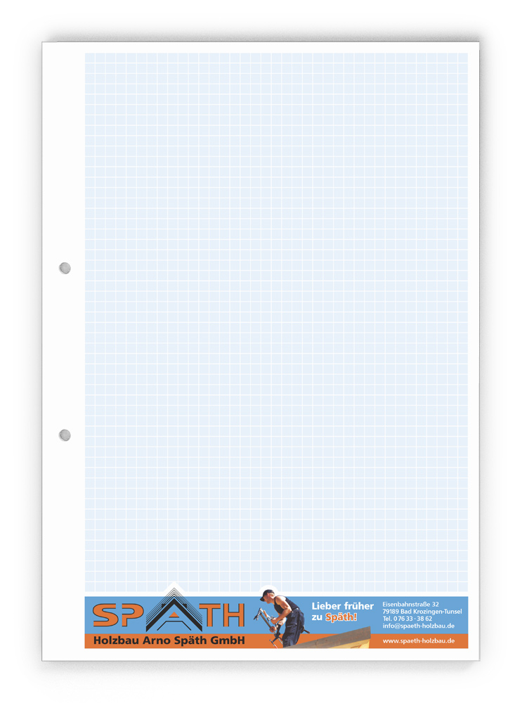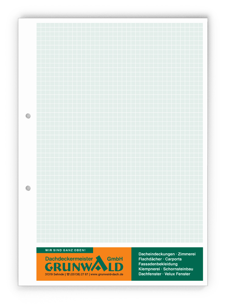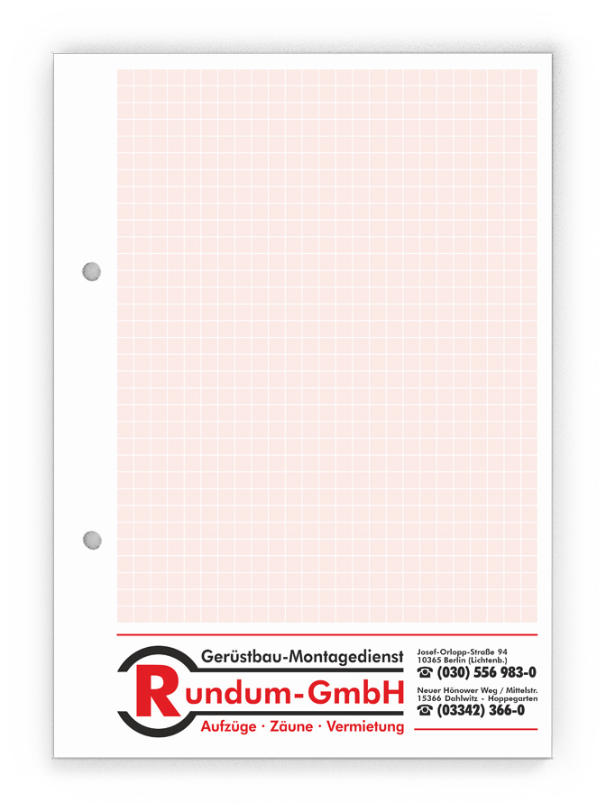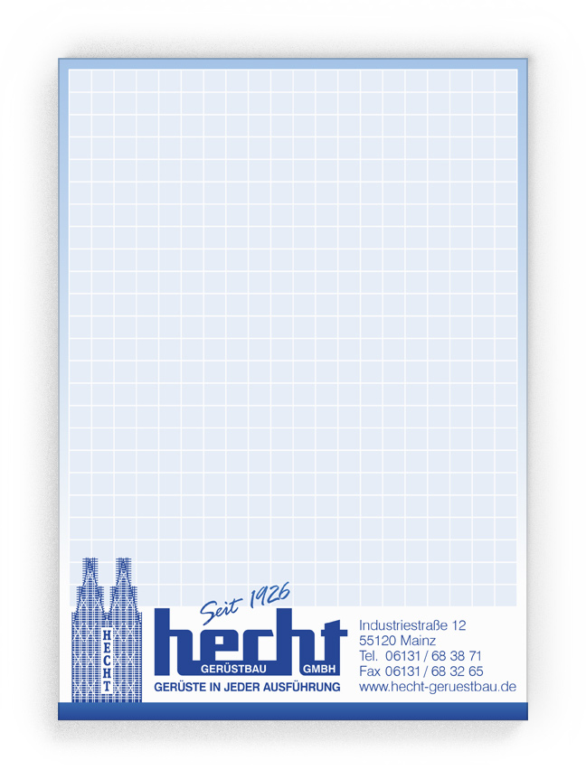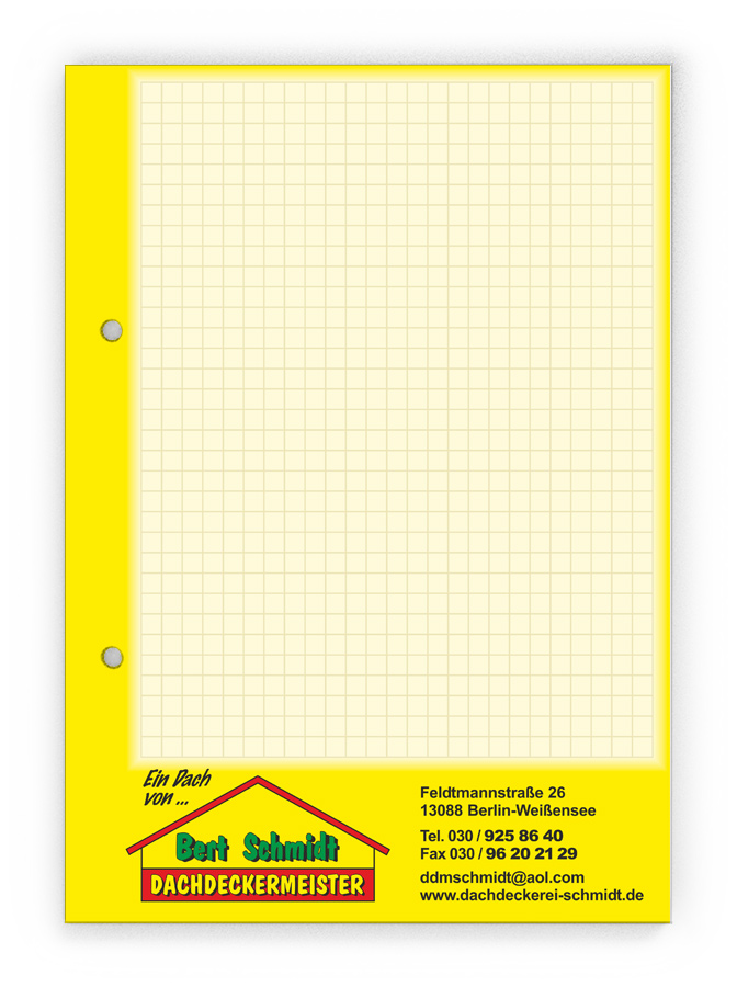 50x Ihre Werbung, die jeden Tag gelesen wird.Unsere Gesprächsnotizblöcke sind auch für Sie der richtige Streuartikel! Der preiswerte und unentbehrliche Werbeträger. Täglich für Ihr Unternehmen im Einsatz. Dank der praktischen Lochung wird Ihre Werbung sogar abgeheftet.