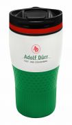Mit zusätzlich ausgestatteter Silikonmanschette und -ring, sehen unsere Thermobecher nicht nur hochwertiger aus, sondern bieten auch mehr Griffigkeit und besseren Stand. Diese sind in 18 Grundfarben lieferbar und heben den Hauptfarbton Ihres Firmenlogos hervor. Der komplette Becher, samt Silikonteile und Deckel ist spülmaschinengeeignet.