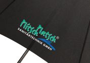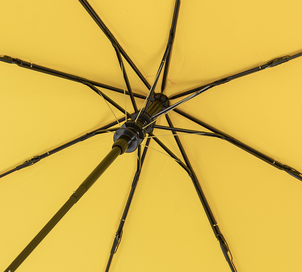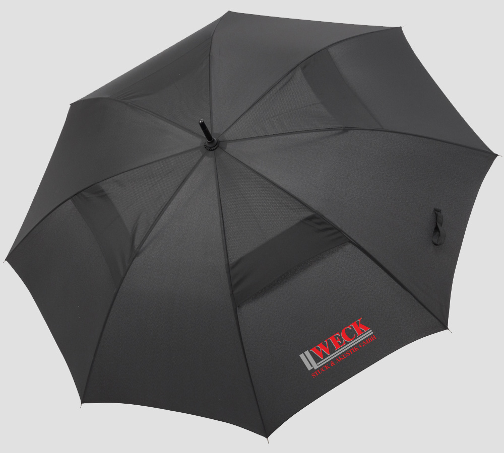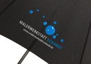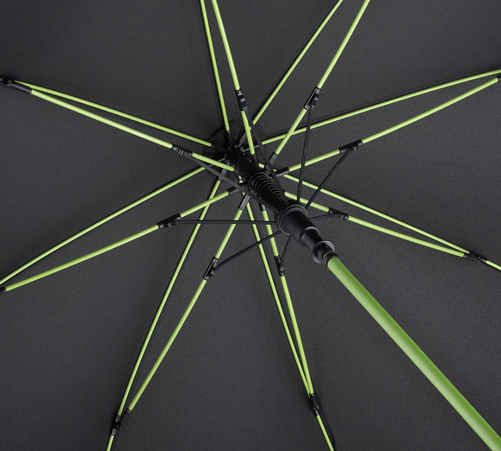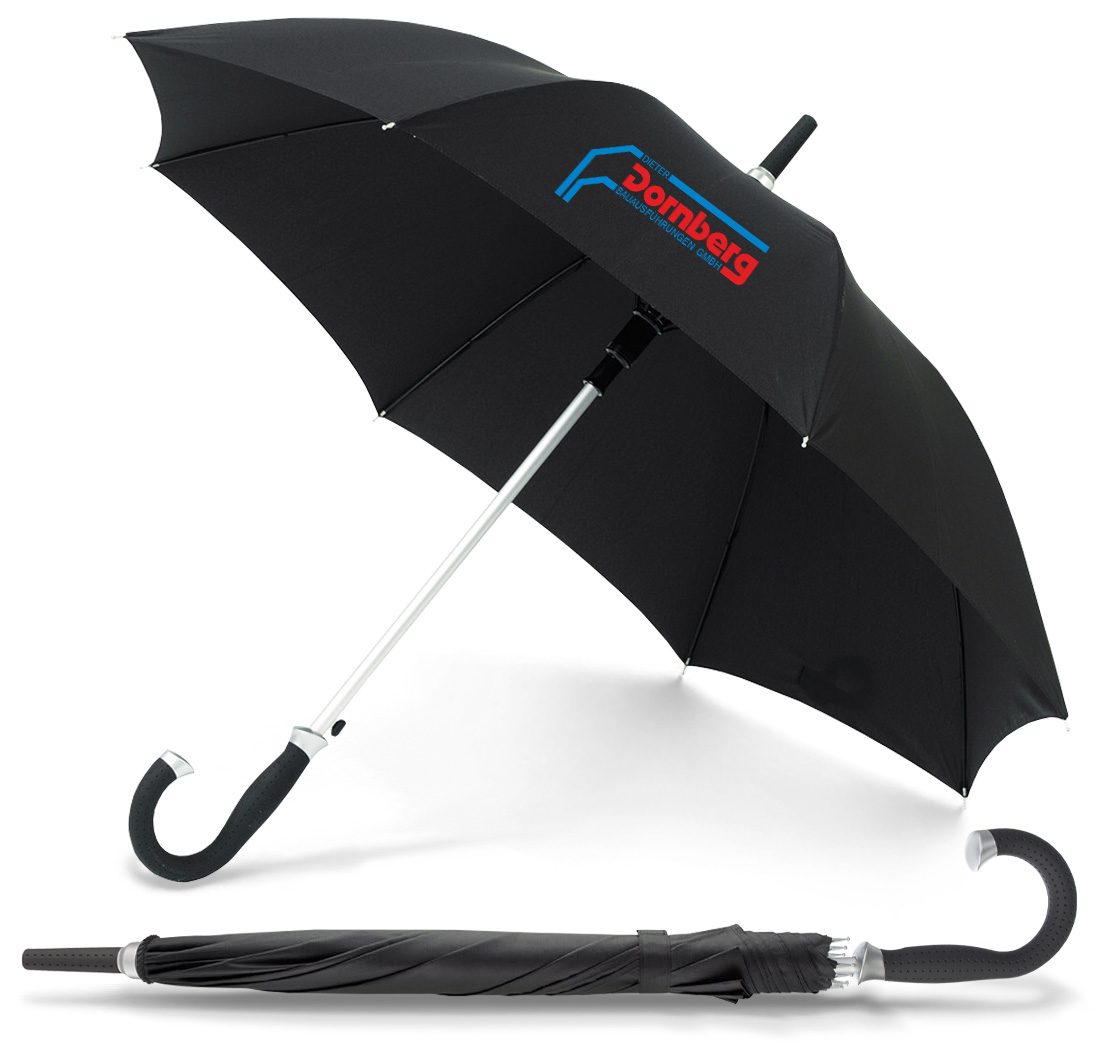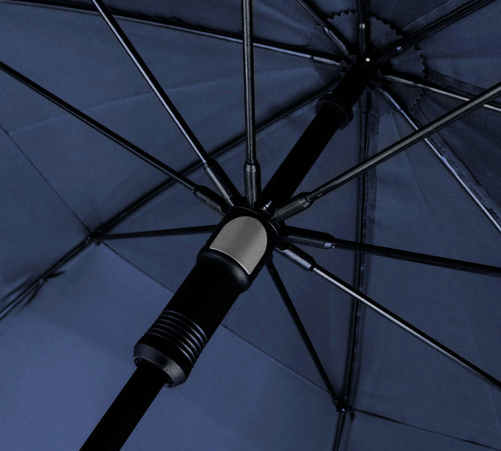 Stylischer Gästeschirm mit komfortabler Öffnungsautomatik, maximale Gestell-Flexibilität (Windproof-System) bei stärkeren Windböen, flexible Fiberglasschienen, stabiler Stahlstock mit farbiger Kunststoffummantelung, gerader Softfeel-Griff mit 7 farbigen Griffringen – passend zu Ihrem Firmenlogo!Speichenlänge: ca. 65 cm