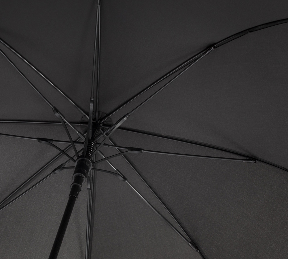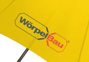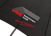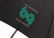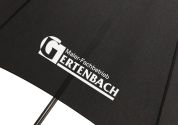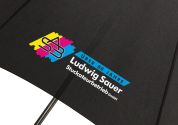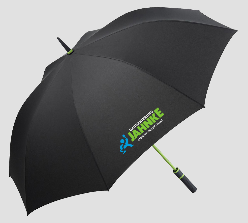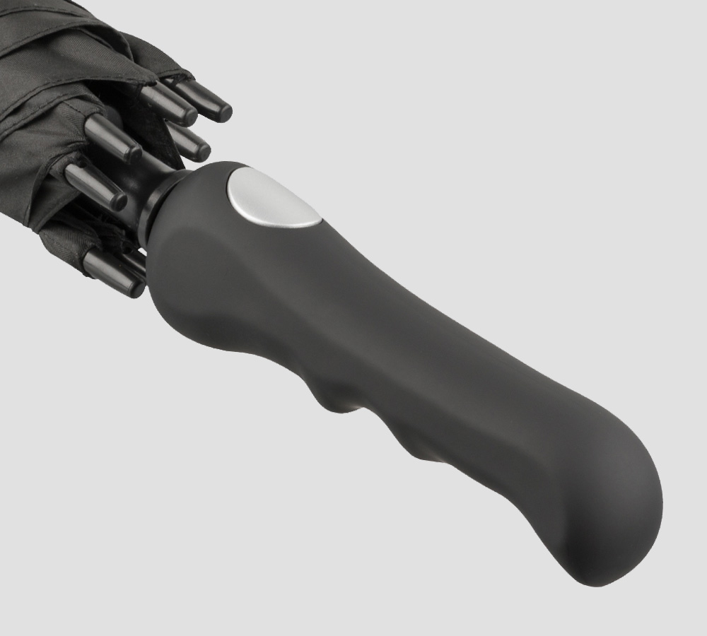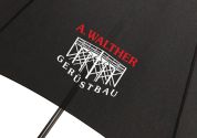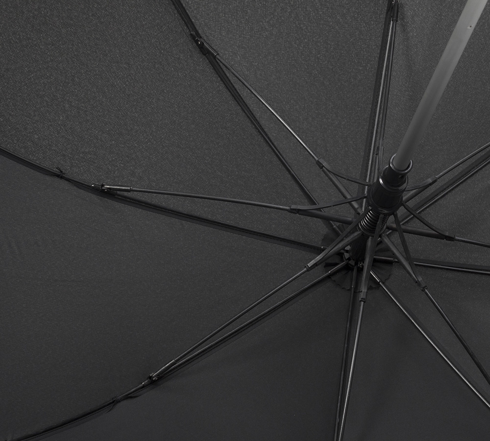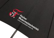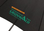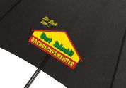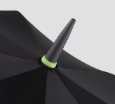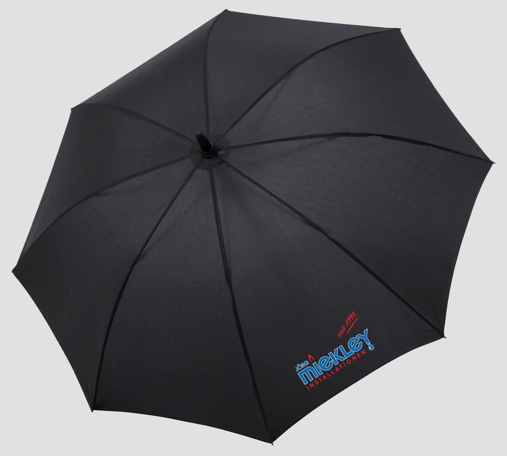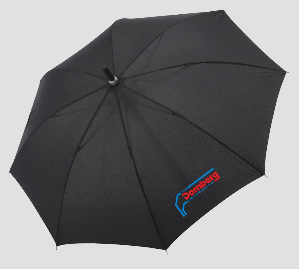 Stylischer Gästeschirm mit komfortabler Öffnungsautomatik, maximale Gestell-Flexibilität (Windproof-System) bei stärkeren Windböen, flexible Fiberglasschienen, stabiler Stahlstock mit farbiger Kunststoffummantelung, gerader Softfeel-Griff mit 7 farbigen Griffringen – passend zu Ihrem Firmenlogo!Speichenlänge: ca. 65 cm