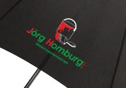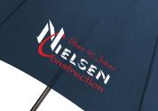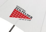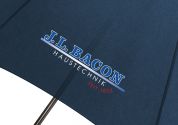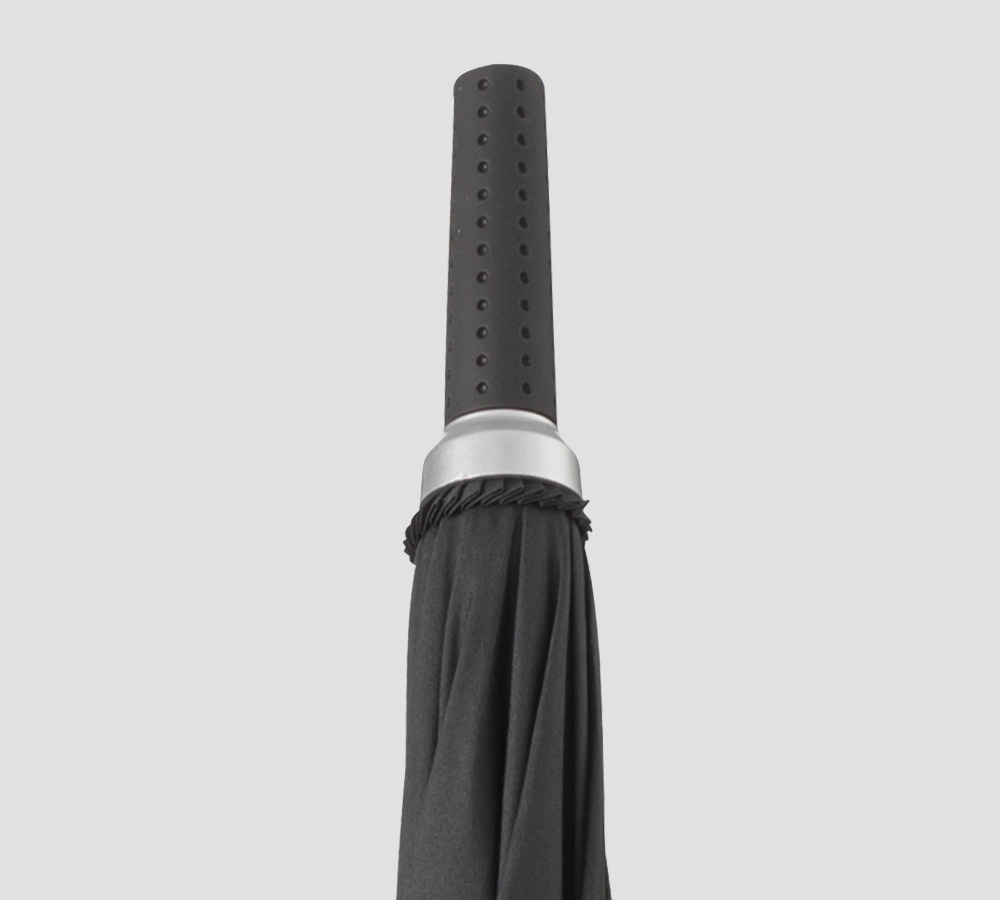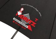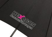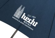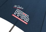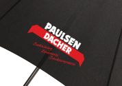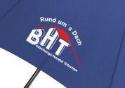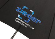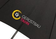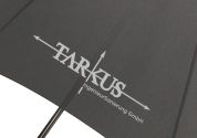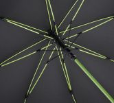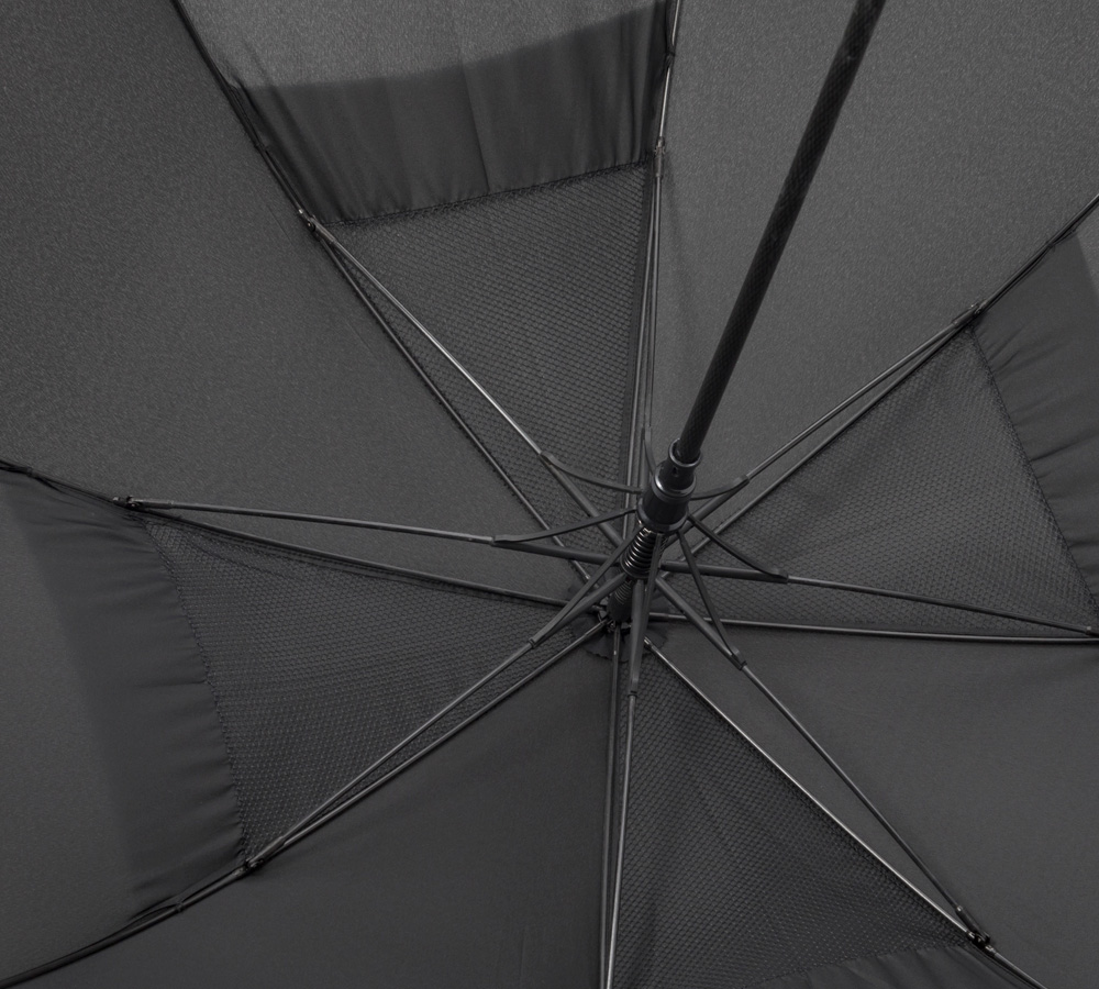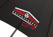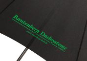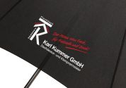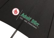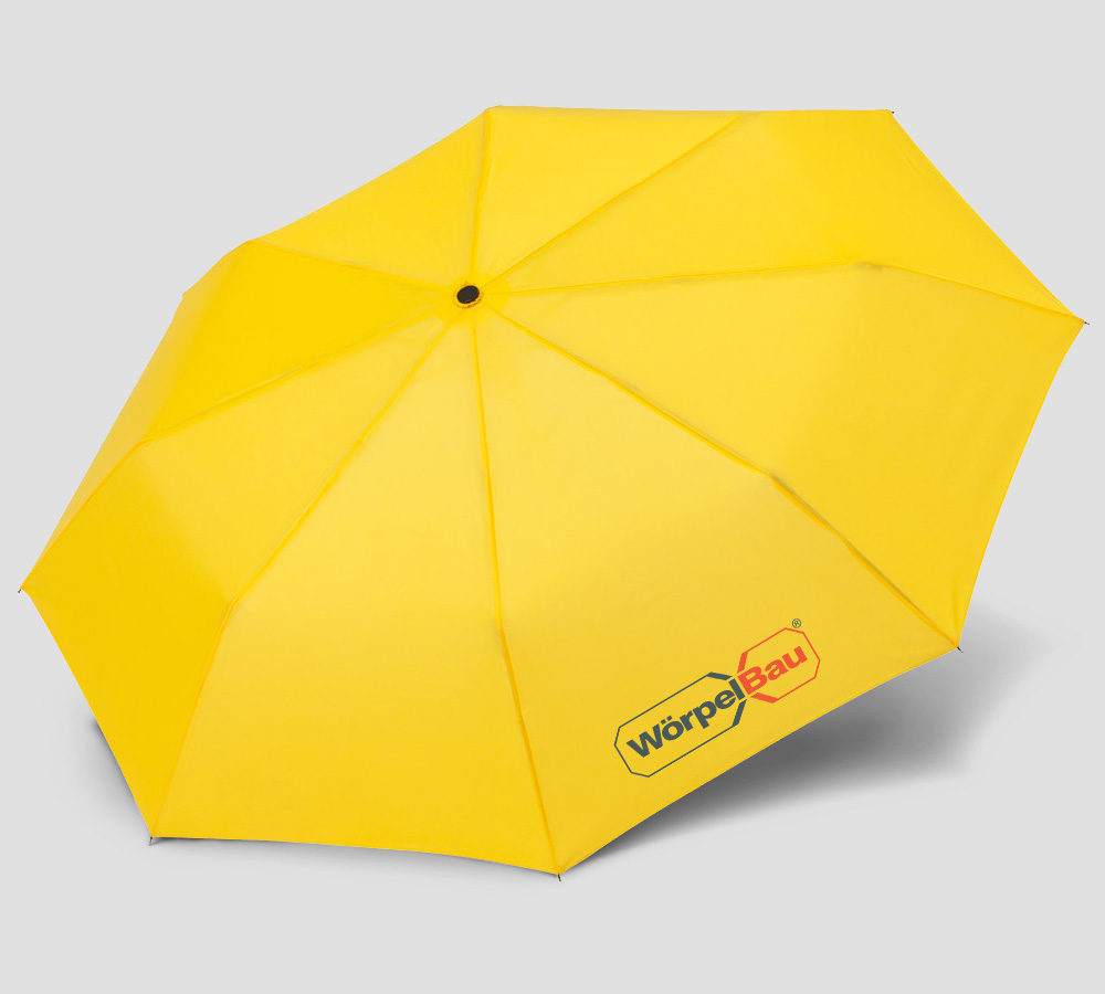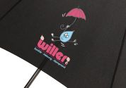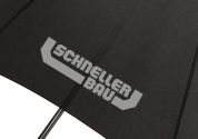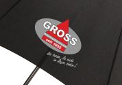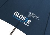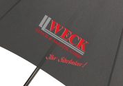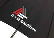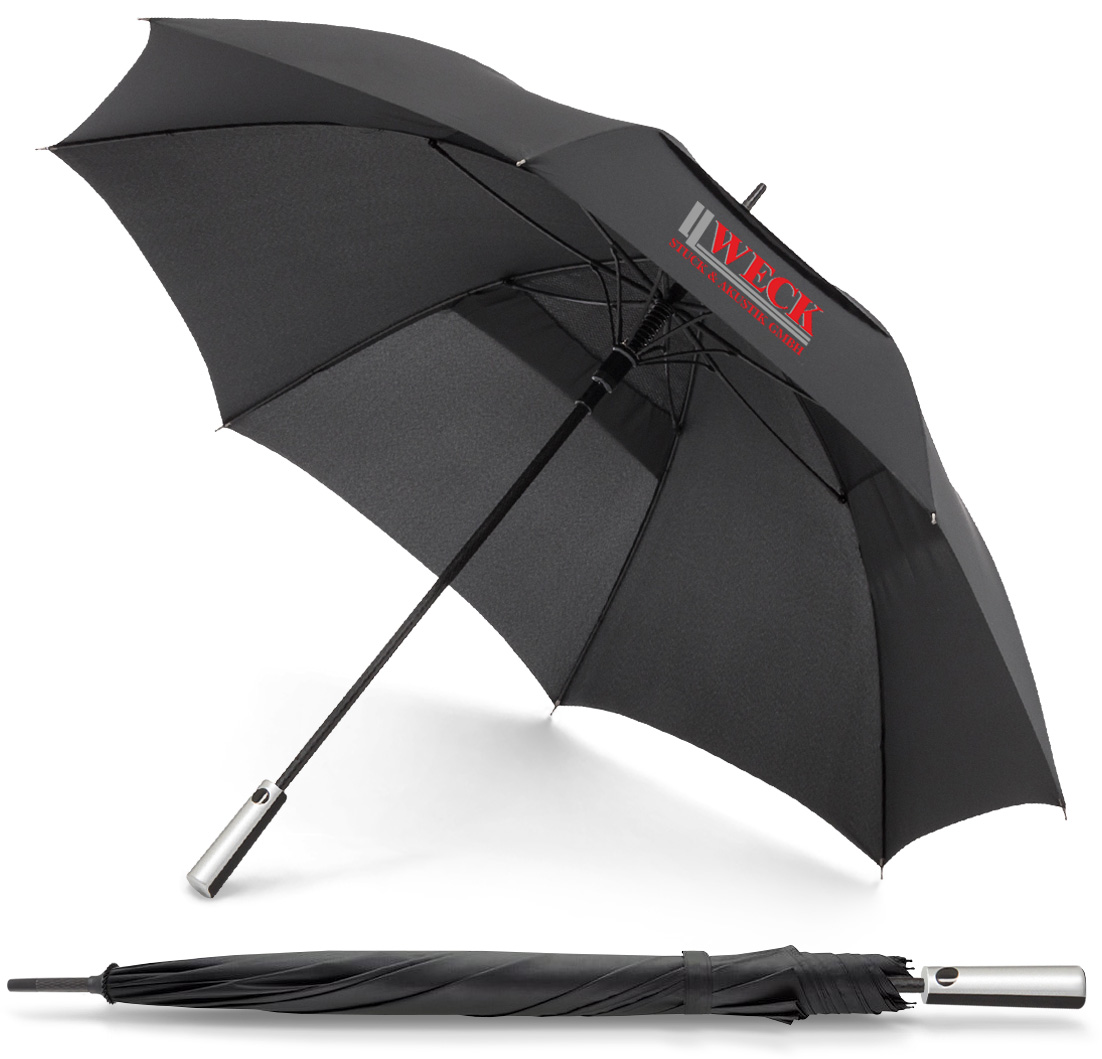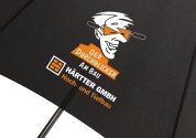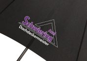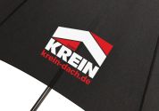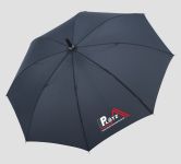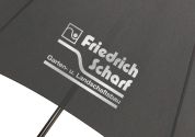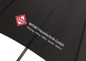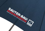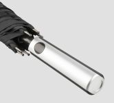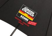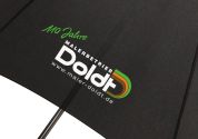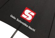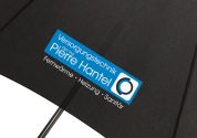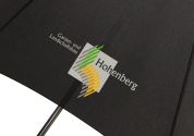 Stylischer Gästeschirm mit komfortabler Öffnungsautomatik, maximale Gestell-Flexibilität (Windproof-System) bei stärkeren Windböen, flexible Fiberglasschienen, stabiler Stahlstock mit farbiger Kunststoffummantelung, gerader Softfeel-Griff mit 7 farbigen Griffringen – passend zu Ihrem Firmenlogo!Speichenlänge: ca. 65 cm