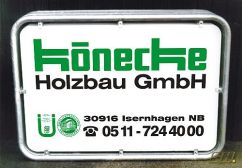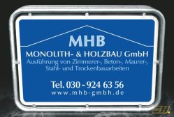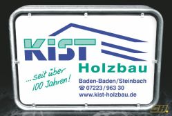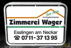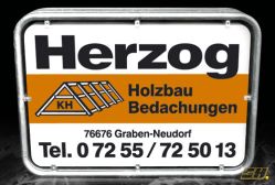 Das Aluminiumrahmenschild wird als Ausstellschild mit Kupplungen am Gerüst befestigt und ragt dadurch auf die Straße hinaus. Es ist sehr auffällig und werbewirksam, da es vom vorbeifließenden Verkehr sofort wahrgenommen wird.