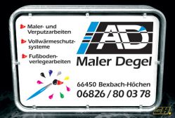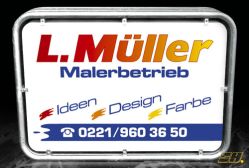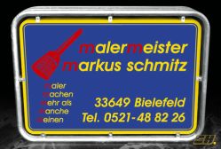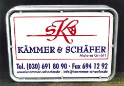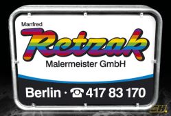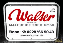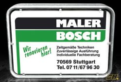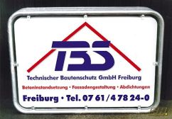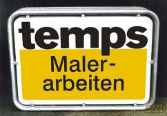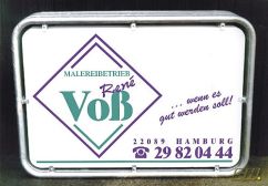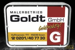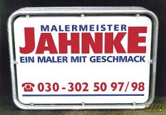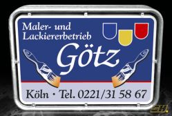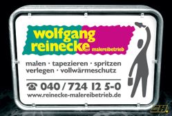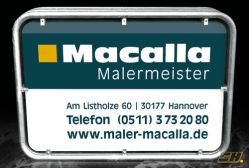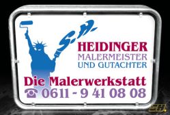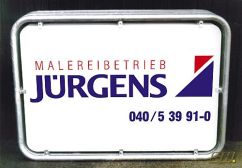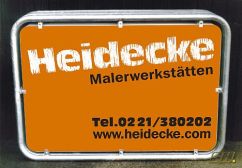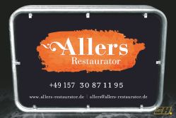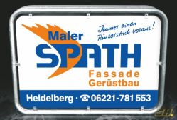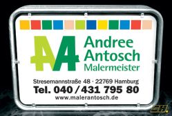 Das Aluminiumrahmenschild wird als Ausstellschild mit Kupplungen am Gerüst befestigt und ragt dadurch auf die Straße hinaus. Es ist sehr auffällig und werbewirksam, da es vom vorbeifließenden Verkehr sofort wahrgenommen wird.